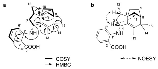 Antartin (1) was obtained as a brown solid. The high resolution fast-atom bombardment mass spectrometry (HRFABMS) spectrum of compound 1 showed an [M]+ ion peak at m/z 339.2196, which suggested the molecular formula C22H29NO2. This molecular formula accounted for nine degrees of unsaturation. The IR spectrum of 1 showed the presence of a secondary amine (3365 cm−1) and a carboxylic acid group (1660 and 2936 cm−1). The 1H NMR spectrum of 1 displayed one nitrogenated methine proton (δH 4.24 (1H, d, J = 6.1 Hz)), one doublet (δH 0.94 (3H, d, J = 6.8 Hz)), and three methyl singlets (δH 1.04 (3H, s), δH 1.10 (3H, s), δH 1.52 (3H, s)). The 1H, 13C, and heteronuclear single quantum coherence (HSQC) spectroscopic data revealed four methyl, seven methine, four methylene, one carbonyl, and six quaternary carbons (Table 1). Interpretation of 2D NMR spectroscopic data allowed us to put together the structure of 1. The 1H-1H correlation spectroscopy (COSY) crosspeaks (H-4/H-3a/H-2/H-12 and H-10/H-9/H-8/H-11) illustrated two spin systems, each composed of four carbon units (C-4/C-3/C-2/C-12 and C-10/C-9/C-8/C-11). Heteronuclear multiple-bond correlation (HMBC) correlations from H-13 to C-5/C-6/C-7, from H-14 to C-6/C-7, and from H-15 to C-7/C-8 allowed us to connect C-5/C-6/C-7/C-8. Furthermore, three-bond HMBC correlations from H-8/H-9a/H-12 to C-1, and from H-2 to C-10, as well as long-range HMBC correlations from H-4 to C-1/C-5 revealed the connectivity of C-4/C-5/C-1/C-10, which completed the construction of a zizaane-type 5/6/5 bridged sesquiterpene ring structure. The COSY crosspeaks (H-3′ (1H, dd, J = 6.9, 2.0 Hz)/H-4′ (1H, dd, J = 6.9, 6.9 Hz)/H-5′ (1H, dd, J = 6.9, 6.9 Hz)/H-6′ (1H, dd, J = 6.9, 2.0 Hz)) revealed a 1,2 disubstituted benzene ring moiety, which was connected to C-4 through NH based on the observation of an HMBC correlation from H-4 to C-1′ and on the carbon chemical shift of C-4 (δC 53.9). Thus, the planar structure of antartin (1) was determined, as shown in Figure 2.