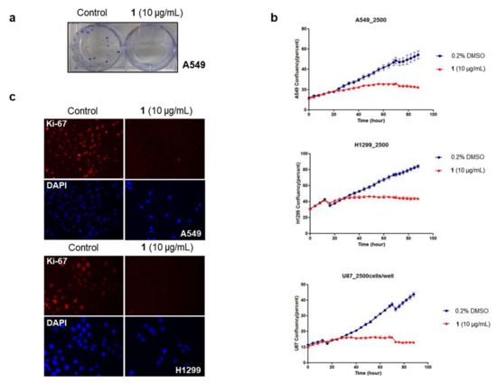 Effect of compound 1 on the growth of lung cancer cells and brain tumor cells. (a) Focus-forming assay. The absence of foci in the 1-treated cells suggests that 1 suppressed lung cancer cell tumorigenic potential; (b) Cell growth assay. Cancer cell growth in real time was monitored for four days after treatment with 1, showing no cell growth (Blue dot: 0.2% DMSO, Red dot: 10 μg/mL 1); (c) Immunofluorescence staining experiment. In 1-treated cells, the expression of Ki-67, a representative proliferation marker, disappeared.