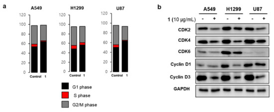 Based on the results of the cell confluency experiment, we decided to probe the cell cycle after treatment with 1 for 24 h, when difference in cell confluence between 1-treated and DMSO-treated cells started to appear. Cell cycle arrest was analyzed by measuring DNA amounts in the G1, S, G2/M phases. Results shown in Figure 5a indicate that tested cancer cell lines induce G1 arrest by treatment with 1, as DNA contents at the G1 phase increased and DNA contents at the S phase decreased. We next evaluated the effects of 1 on the expression of cell cycle check proteins, which are exclusively observed in the G1 phase transit to the S phase. Figure 5b showed that cell cycle-regulating proteins such as CDKs and cyclins were downregulated by treatment with 1 [22].