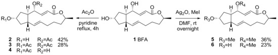 Early synthetic derivatization was executed of BFA itself to improve its physical properties. The production of a prodrug of BFA employing esterification or simple alkylation of two hydroxyl groups was usually pursued [14], although distinguishing between these two secondary hydroxyl groups was difficult in normal conditions, as shown in Scheme 1. For further SAR studies, however, this research by Hori group provided the basic information on the two hydroxyl groups [18]. Acetylation of BFA using acetic anhydride in refluxing pyridine afforded 4-acetyl BFA 2 and 4,7-diacetyl BFA 3 simultaneously. The compound 7-acetyl BFA 4 could be isolated after the treatment of BFA in refluxing acetic acid [19]. A similar modification was also observed in an O-methylated BFA synthesis. The compounds 4-O-methylated BFA 5 and 4,7-di-O-methylated BFA 6 could be obtained together and purified after treatment of BFA with silver oxide and iodomethane.