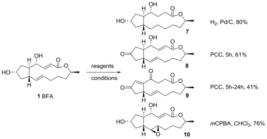 Hori group also reported an oxidation–reduction protocol to afford BFA analogs in different oxidation states [20], as shown in Scheme 2. Conventional hydrogenation of BFA using H2, Pd/C produced conformationally free 13-membered lactone 7 in good yield. Pyridinium chlorochromate (PCC) oxidation of BFA also gave 7-keto BFA 8 in short time, while this condition gave isomerized 4,7-diketo BFA 9 over a prolonged reaction time. To add conformational rigidity, oxirane functionality was introduced into an electron-rich alkene in BFA, employing meta-chloroperoxybenzoic acid (mCPBA). This reaction proceeded in good yield and in a stereoselective manner: