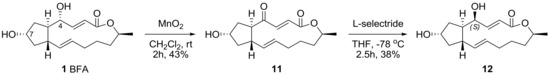An oxidation–reduction protocol was also utilized to inverse the chirality of the 4-hydroxyl group in BFA. The selective oxidation of allylic alcohol followed by a chemoselective reduction of BFA was performed, as shown in Scheme 3. Although each reaction condition produced BFA itself with no reaction from MnO2 oxidation (41%) or undesired reduction from l-selectride (52%), this reaction sequence produced 4S-BFA 12, which is important for a systematic, original SAR study.