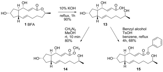 The 13-membered lactone skeleton was hydrolyzed to find the relationship between ring conformation and activity in BFA (Scheme 4). BFA was hydrolyzed in basic conditions to produce seco acid 13 in good yield. The seco acid 13 was esterified again under O-methylation or in the Fischer esterification condition to make methyl ester 14 or benzyl ester 15, which were tested for their biological activity.