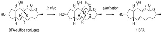 Since its first isolation from Penicillium decumbens in 1958 [1], brefeldin A (BFA) has been touted as a promising lead molecule in the world of drug development because of its potent biological activity in the antitumor [2], antifungal [3], and antiviral [4] fields. More importantly, its apoptosis-inducing properties [5,6] in various cancer cell lines and its ability to disrupt the cis-Golgi apparatus [7,8] drove medicinal chemists to discover more advanced pharmaceutical compounds (APIs) derived from BFA [9]. This medicinal promise drove the recent isolation of BFA from marine fungi, such as Penicillium sp. PSU-F44 or Penicillium sp. DT-F29, along with its other various structural analogs which were expected to be promising hits for drug development [10,11]. Unfortunately, its poor physical and pharmacokinetic (PK) properties hampered further development [12,13,14]. In response to these hurdles, a tremendous synthetic and medicinal chemistry effort has been put forth to improve its physical and PK properties, along with its own biological activities [15,16].