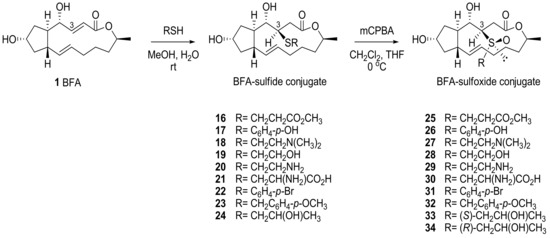 Another medicinal chemistry approach was employed to produce a water-soluble prodrug. For this purpose, Cushman group tried to change the C2–C3 alkene functional group of BFA with various sulfide moieties to produce a latent leaving group via in vivo oxidation and syn-elimination [21], as shown in Scheme 5. The addition of various thiols was tried in order to improve BFA activity and water solubility, to proceed with a study of facial selectivity.