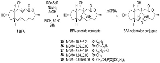 For more promising analogs, selenide-conjugated analogs were also prepared using a similar strategy. In Scheme 7, mCPBA oxidation of the selenides 35 produced the corresponding selenoxides (61%) along with BFA (38%), and this emphasized the higher lability of the selenide functional group for syn-elimination. This reactivity could be utilized for the production of another potential BFA prodrug.