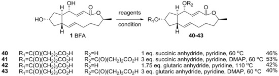 Cushman group also reported an ester analog of BFA [24], as shown in Scheme 8. It was envisioned that a long lipid chain may present the possibility to use an affinity column preparation to directly find a binding site. Because the biological response of BFA was unique and complex depending on the cancer cell line, a target fishing strategy using an affinity column was desired to find BFA’s possible biological mechanisms of action. However, the presence of two secondary hydroxyl groups made it difficult to synthesize a specific and active affinity matrix. In addition, the modification of the two hydroxyl groups could affect the SAR study. So, various alkyl chains should be linked to BFA not only to find target sites, but also to discover active analogs. A succinyl or a glutaryl group was attached to BFA via reaction condition screening.