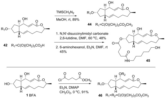 Further modifications for SAR studies and affinity matrix preparation were executed as shown in Scheme 9. A simple esterification with TMSCH2N2 was carried out to give ester analog 44 in good yield. More importantly, a longer lipid chain was introduced by the activation of the carboxylic acid in 42 and amide coupling with 6-aminohexanol, to provide hydroxyl analog 45. This analog could be utilized for affinity matrix preparation using biotin or resin with the purpose of finding a target site in cells so long as this analog does not lose BFA own biological effect on cancer cell lines. Bisfunctionalization of 4,7-dihydroxyl BFA was also carried out via a simple esterification reaction.