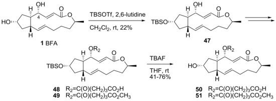 Scheme 10 describes the monofunctionalization at the 4-hydroxyl group in BFA. A protection reaction was necessary for selective modification, because the 7-hydroxyl group was more reactive than the 4-hydroxyl group. t-butyldimethylsilyl (TBS) protection afforded monosubstituted BFA 47 in low yield. With this 7-protected BFA prepared, similar functionalizations were executed to give the desired monosubstituted analogs at the 4-hydroxyl group in BFA after conventional TBS deprotection.