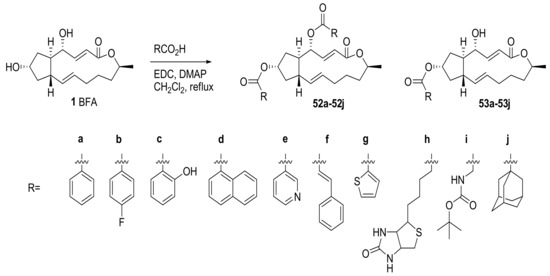 More various functional groups, including aromatic esters, were also attached to BFA to evaluate their anticancer activity. Zhu group reported the synthesis of a BFA-based prodrug via simple esterification with various aromatic or alkyl groups, as shown in Scheme 11 [9]. These analogs were evaluated in TE-1 cell line, showing moderate activity for the analogs 52a, 53a, and 53h. Because the in vivo stability of BFA hampered its further development, a stability test of the analog 53h was also carried out to find if it could be utilized for BFA prodrug production.