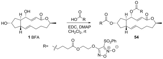 A recent impressive BFA analog was developed using a nitric oxide (NO)-producing moiety [25], as shown in Scheme 12. Since an NO donor hybrid was used for chemotherapy, it has been employed to strengthen the cytotoxicity level of anticancer agents such as evodiamine or spirolactone-type diterpenoid. Furoxan, a NO-producing subunit, was attached to BFA on the basis of SAR. After extensive screening and optimization of conditions, the compound 54 was found to be active against prostate, colon, and liver cancer cell lines with IC50 of nanomolar concentration. This cytotoxicity is consistent with the high NO-producing ability of 54 in HepG2 (liver cancer) cells. It is also important that 54 induced apoptosis of HepG2 cells in a dose-dependent manner, and apoptosis was reduced when hemoglobin, an NO scavenger, was present. This means that an NO-producing ability is important for the induction of apoptosis in cancer cell lines. The employment of a protein array indicated that survivin and heme oxygenase-1 and 2 are related to this apoptotic response of BFA analog 54.