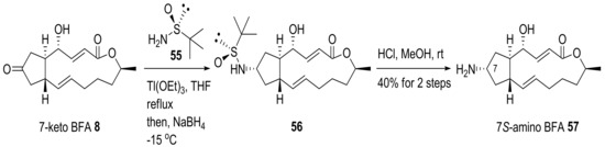 Amino-BFA analog 57 was prepared using reductive amination of 7-keto BFA 8 and chiral sulfinyl amine 55, followed by acidic deprotection [26], as shown in Scheme 13. However, when 57 was used to treat HeLa cells to observe its disrupting effect on the Golgi complex, it showed less activity than BFA itself.