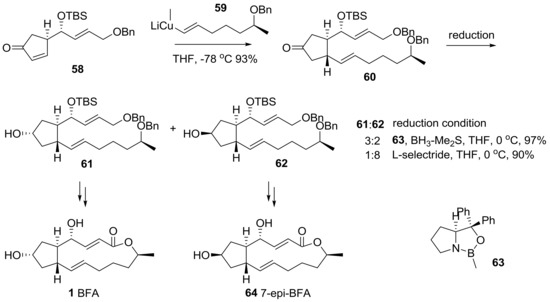 Wu group reported a conjugate addition of vinyl cuprate 59 to substituted cyclopentenone 58 to build another side chain in the BFA framework [27], as shown in Scheme 14. While an achiral reduction afforded the undesired epimer 62 as a major product, a chiral reduction using (S)-CBS reagent 63 was carried out to produce the desired secondary alcohol 61 as a major product. The desired alcohol 61 and its epimer 62 were transformed into BFA 1 and 7-epi-BFA 64, following the conventional reaction route.
