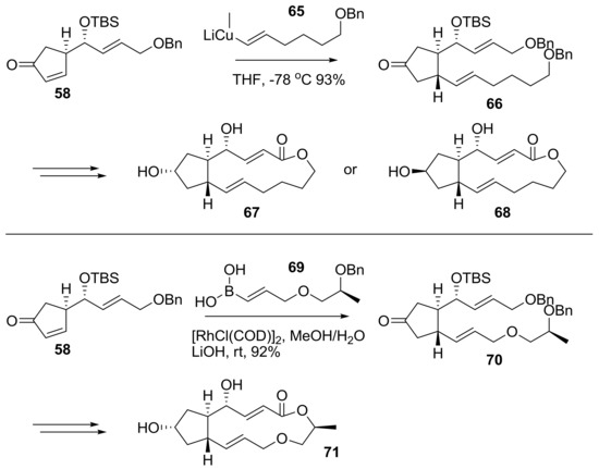 After the development of a synthetic route to BFA, its variation using different synthon was tried to make BFA analogs, as shown in Scheme 15 [28]. Desmethyl BFA 67 and its 7-epimer 68 were prepared from a similar reaction route, employing desmethyl side chain 65 instead of 59. A similar strategy was also tried for 13-oxo-BFA analog 71 synthesis [29]. Using vinylborane 69 from lactic acid, an Rh-mediated conjugate addition was carried out to attach a side chain in the BFA skeleton. Following a similar reaction pathway, 13-oxo-BFA analog 71 could be obtained uneventfully. It is interesting that the same strategy was also applied to pursue 13-thio-BFA, which could not be synthesized via an Rh-mediated coupling reaction.