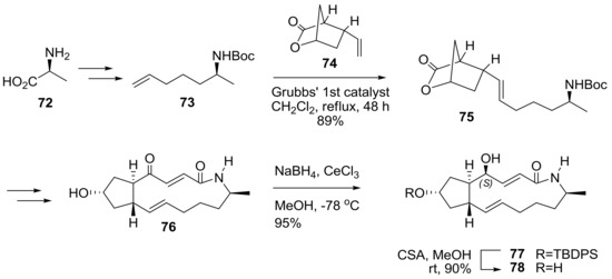 Amino-BFA was also prepared in Scheme 16. To introduce nitrogen in the BFA structure, alanine 72 was chosen as the starting material for side chain 73. After efficient cross metathesis (CM) [30] with side chain 73 and bicyclic lactone 74, the desired CM adduct 75 was successfully transformed to unsaturated enone 76. For the completion of the synthesis, a Luche reduction was tried to establish a 4R chiral alcohol moiety. However, this reaction condition, surprisingly, afforded the undesired epimer 77 as a single diastereomer. After an extensive survey of the reaction conditions and structural confirmation, the synthetic program ended with the synthesis of the 4-epi-BFA lactam 78 analog [31].