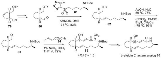 Another approach to prepare a lactam analog of brefeldin was tried using a different synthetic route as shown in Scheme 17 [32]. Helmchen group developed an efficient synthesis of substituted cyclopentene 79 using catalytic allylic alkylation of cyanomalonate with chiral iridium as a catalyst. After hydrogenation, semi-reduction, and epimerization, chiral aldehyde 80 was obtained quickly and submitted to Julia-Kocienski olefination with sulfonyltetrazole 81 to produce trans-alkene 82 in good yield. Treatment of 82 with acidic deprotection and Swern oxidation afforded the resulting aldehyde 83, which was then submitted to Nozaki-Hiyama-Kishi (NHK) alkenylation with iodoacrylate 84, with nickel/chrome as a catalyst. Although this reaction gave the undesired Si-face product as a major isomer, with a small amount of the desired Re-face adduct, it could be easily and successfully converted to 7-deoxy brefeldin A (brefeldin C) lactam analog 86.