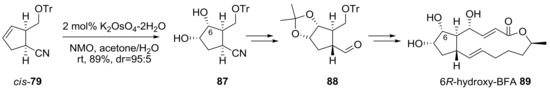 Instead of hydrogenation, dihydroxylation of cyclopentene 79 was carried out to introduce a hydroxyl group at the C6 position [26], as shown in Scheme 18. Two substituents of cis-79 possessed a β-face of the cyclopentene plane, and directed catalysis of potassium osmate occurred on the α-face dominantly. With dihydroxyl cyclopentane 87 prepared, a similar conversion, as in Scheme 17, including semi-reduction, epimerization, Julia-Kocienski olefination, and Nozaki-Hiyama-Kishi alkenylation was executed to produce the (6R)-hydroxy BFA analog 89. It is impressive that Golgi complex redistribution was observed in mammalian or plant cells when 89 was used to treat the cells, as observed for BFA [33].