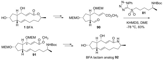 Helmchen group also reported the semi-synthesis of BFA analogs using hybridization of a BFA skeleton and artificial side chains [26], as shown in Scheme 19. Starting from BFA, protection and chemoselective olefin cleavage of the electron-rich olefin were tried to obtain properly substituted cyclopentanyl aldehyde 90 in a large scale. Employing olefination with sulfonyl tetrazole 81, as previously done, the unsaturated methyl ester 91 could be obtained in one step with a formidable 4R-configured hydroxyl group. Conventional transformations, including deprotection and lactamization, finally afforded BFA lactam 92.