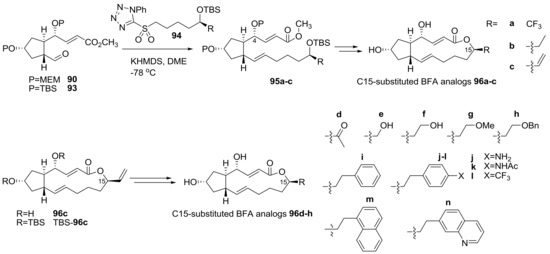 A similar semi-synthetic approach was also applied for the preparation of C15-substituted BFA analogs, as summarized in Scheme 20 [34]. The C15 position had been so far hardly changed because it did not have any active functional group. Employing this semi-synthesis however, it was possible to efficiently introduce unprecedented modifications at the C15 methyl group of BFA. The preparation of variously substituted sulfonyl tetrazoles 94, followed by Julia–Kocienski olefination with bis-protected aldehyde 90 or 93 from BFA, produced a versatile synthesis of substituted ester 95 in good yield. Finally, deprotection–esterification afforded the C15-substituted BFA 96a–c analogs uneventfully. The vinyl group at C15 in analog 96c was also utilized for further transformation. Wacker oxidation, Suzuki coupling, or hydroboration was applied to add a carbonyl, an aromatic, or a hydroxyl group, respectively. After various transformation stages, 15 analogs were prepared for SAR study. Some of them are represented below.