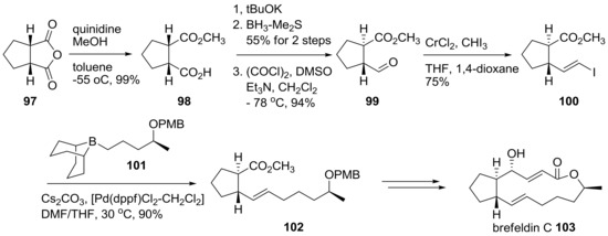 An asymmetric desymmetrization route of the BFA skeleton was also developed, as summarized in Scheme 21 [35]. Cyclopentylsuccinic anhydride 97 was submitted to asymmetric methanolysis using quinidine, a chiral natural amine, for the stereogenic differentiation of two carbonyl groups. A resulting chiral carboxylic acid was treated for epimerization, reduction, and Swern oxidation to produce trans-substituted cyclopentane 99 in good yield. After Takai olefination of aldehyde 99, followed by Suzuki coupling with chiral borane 101, trans-alkene 102 was obtained. By employing three carbon homologations, using acetylide addition or NHK reaction and usual transformations, brefeldin C 103 could be obtained successfully.