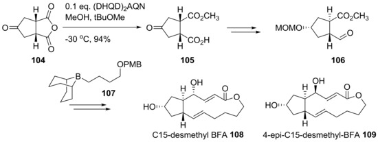 This strategy was also utilized to synthesize desmethyl BFA analogs 108 and 109 [36], as shown in Scheme 22. By employing the same strategy for chiral desymmetrization of anhydride 97, oxocyclopentyl anhydride 104 could be efficiently converted to chiral ketone 105. Instead of 101, desmethyl side chain 107 was used to synthesize C15-desmethyl BFA analogs 108 and 109, following the procedure developed in Scheme 21.
