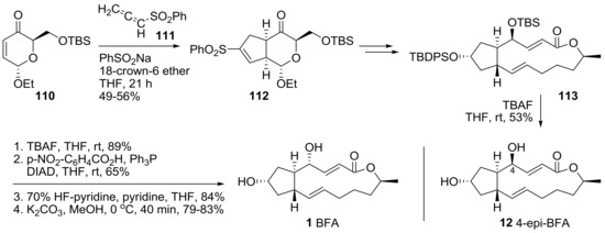 A recent synthetic study employing a [3+2]-cycloaddition route was reported to enable a versatile synthesis of BFA 1 and 4-epi-BFA 12 from BFA, in a unified strategy [37]. In Scheme 23, cycloaddition of unsaturated enone 110 with allenylsulfone 111 afforded cyclopentane 112 in a stereoselective manner. After conversion of sulfonylalkene to the corresponding ketone, and following the reaction route, bis-protected BFA skeleton 113 could be obtained efficiently. Finally, BFA 1 and its C4-epimer 12 were prepared in the reaction conditions shown below. Direct global deprotection of 113 afforded 4-epi-BFA 12 in moderate yield, while selective TBS deprotection, followed by Mitsunobu inversion and sequential deprotection, yielded BFA 1 in a straightforward manner. With this synthetic route developed, a more promising synthetic analog of BFA can be anticipated in the future.