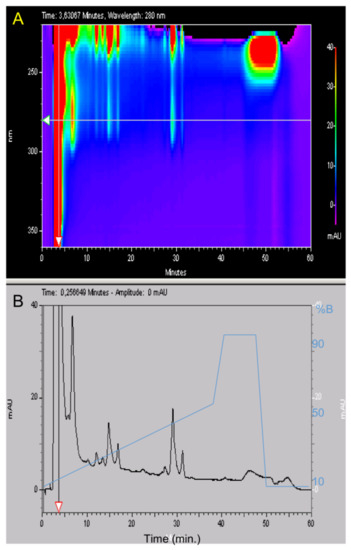 3D Analytical HPLC of Anemonia viridis tentacles after phase extractions, centrifugation and filtrations and before semi preparative HPLC. The UV absorbance of the effluent was measured with a diode ray detector. (A) A 3D plot displaying elution time from 0 to 60 min (x axis) regarding wavelengths from 220 to 330 nm (y axis). The z axis corresponds to different peak intensities and is represented with a color scale going from 0 (purple) to 40 mAU (red). The horizontal arrow shows the 280 nm wavelength. (B) Elution time regarding absorbance at 280 nm from 0 to 40 mAU and the acetonitrile (%B) gradient in blue. The vertical arrow shows the retention time of the major peak at 4 min that is out scaled with an absorbance at 500 mAU.