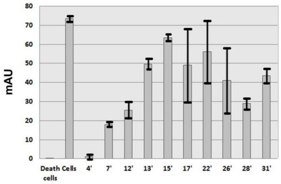 A screening was carried out with the nine protein fractions and the alkaloid pigments as control to measure the capacity of these proteins to inhibit HMEC proliferation. This experiment was performed twice with fractions from the second purification. The test was carried out with a 10 µM concentration for the nine protein fractions and the alkaloid pigments. It was important in this test that living cells remained detectable to differentiate between cytotoxicity and proliferation inhibition. Proliferation inhibition was characterized by a decrease of absorbance (Figure 2). The absorbance was proportional to the mitochondrial activity. Only three protein fractions were able to limit HMEC proliferation up or below to 50% at 7 min, 12 min and 28 min (Figure 2). No absorbance due to cellular death was observed with the alkaloid pigments (Figure 2, 4 min). Cytotoxicity of Anemonia viridis alkaloid pigments was previously reported [17]. Trace of alkaloid pigments was observed in analytical HPLC of 7 min and 12 min proteins (data not shown) and the decrease of absorbance >50% could be due to cytotoxicity and not to an inhibition of proliferation due to an antiangiogenic activity. Alkaloid pigments were present in fraction 17 min, 22 min and 26 min in the second purification and may explain the high variation between the two experiments.