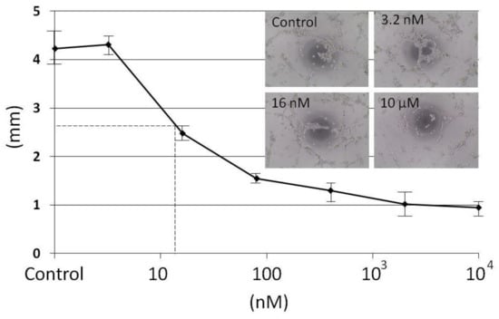 A first screening at 10 µM made with the fractions obtained from SP HPLC showed that the capillary network formation was inhibited only with the 28-min fraction and not with the 7 min- and 12-min fractions where the remaining living cells were able to display a network (data not shown). To measure a dose effect of the 28-min fraction on HMEC tubulogenesis, seven dilutions from 10 µM to 3.2 nM (dilution factor 1/5) were tested (Figure 3). A capillary network with interconnected lines similar to control is observed only at 3.2 nM (Figure S1 in Supplementary Materials). To determine the half effect, a dose–response curve was established by measuring the capillary length with METAMORPH 7.6 software for each dilution (Figure 3).