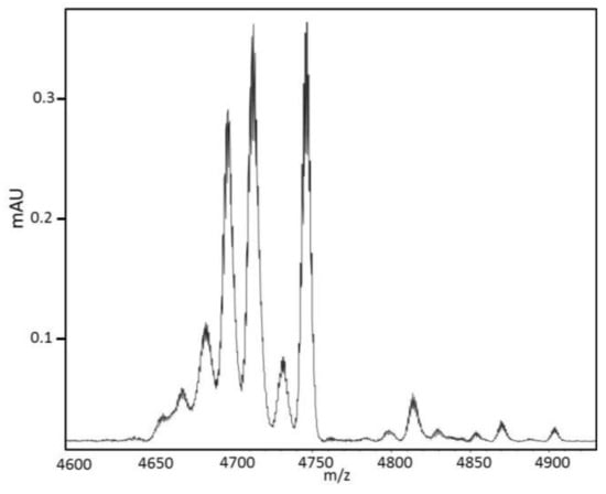 A first Matrix-Assisted Laser Desorption Ionization Mass Spectrometry (MALDI MS) at low resolution gave a molecular weight of 4730 Da for the 28-min fraction. However, high resolution MALDI MS revealed that the 28-min fraction was most heterogeneous and contained up to ten proteins (Figure 4). The three main proteins had average molecular weights corresponding to 4692, 4708 and 4742 Da. To further investigate on the monoisotopic mass of the protein content, the 28-min fraction was also analyzed with high resolution Orbitrap Mass Spectrometry (Figure S2 in Supplementary Materials).