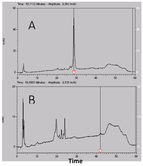 Enzymatic digestion of the 28-min fraction with a Trypsin/Lys C mixture at 37 °C for: one hour (A); and three days (B). The 28-min fraction displayed only one peak and remained almost unchanged after one-hour digestion, while it should have completely disappeared. This experiment suggested that the 28-min fraction contained a Trypsin inhibitor. The Trypsin/Lys C mixture eluted at 42 min. Another digestion experiment with only Trypsin gave the same results with 72 h necessary to have a complete digestion (Figure S6 in Supplementary Materials).