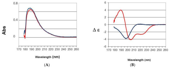 Spectra were measured with a 100 µm path length from 260 to 178 nm at 20 °C on a JASCO J-810 spectropolarimeter. Data were collected at 0.5 nm intervals using a step auto response procedure (JASCO, Oklahoma City, OK, USA) and the buffer background was subtracted. Protein concentrations were 1 mg/mL in 20 mM pH 7 phosphate buffer. Absorption spectra were measured to verify both concentration and light transmission. CD spectra are presented as ∆ε per amide rather than in ∆A unit to have a measure independent of mass and concentration according to the Beer Lambert law. Furthermore, the signal was divided by the number of amino acid residues of the protein minus one to have ∆ε per amide [17]. The instrument was calibrated with (+)-10-camphorsulfonic acid, a ratio of 2:1 was found between the positive CD band at 290.5 nm and the negative band at 192.5 nm.