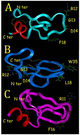 A first energy minimization and dynamic procedure was carried out with only one disulfide bridge (4C-C39) to connect the N and C terminus of BDS-5 with the four other cysteines being free. Structural changes due to dynamic procedure and the constraint related to this 4C-C39 disulfide bridge made it possible to have the SH group at the right position to constitute two other disulfide bridges, 6C-C32 and 22C-C40. A final energy minimization procedure made it possible to obtain a final BDS-5 model 3D structure with a low van der Waals energy (Figure 7). Kunitz-type structures are low molecular weight proteins characterized by a short alpha helix, a two-beta strand sheet and three disulfide bridges as the SHPI-1 sea anemone protein [18]. Molecular modeling showed that it was possible to have a BDS-5 model 3D structure compatible with a Kunitz-type structure with disulfide bridges similar to BDS-1. Attempt to create a BDS-5 model using a first disulfide bridge constraint with 4C-C40 was not possible because it induced the collapse of the C terminal alpha helix to constitute the two other disulfide bridges. It is important to note that another BDS-5 model was possible from BDS-1 NMR structure [7]. In that case, the BDS-5 model was similar to BDS-1 with the F18 lateral chain located at the L18 position (Figure 7B). In the two BDS-5 models, F18 appeared located similarly (data not shown). It is interesting to note that F16 in the SHPI-1 crystal structure had also a similar position (Figure 7A,C). R11 and F18 in SHPI-1 were the residues involved in the inhibition of Elastase [18], and the BDS-5 3D structure model showed that R12 was located similarly to R11 in SHPI-1 (Figure 7A,C). The presence of a C terminal alpha helix induced a major change in the location of the 12RGD14 motif for the BDS-5 structure model (Figure 7A) compared to BDS-1 NMR structure (Figure 7B). Contrary to BDS-1, the 12RGD14 motif in the BDS-5 structure model was well exposed to solvent and on the opposite side (Figure 7A).