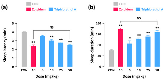 Effects of triphlorethol A and zolpidem on sleep latency (a) and sleep duration (b) in pentobarbital-treated imprinting control region (ICR) mice. Drugs were administered (p.o.) to mice 45 min before pentobarbital injection (45 mg/kg, i.p.). Each column represents mean ± SEM (n = 10). * p < 0.05, ** p < 0.01, denote cases which were significantly different when compared to the control (CON) group (Dunnett’s test).