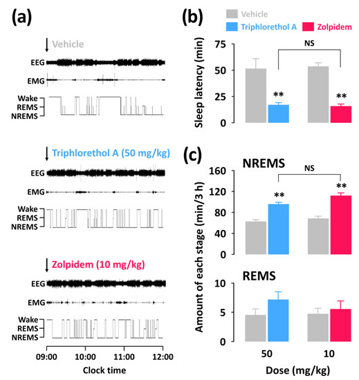 The values of sleep latency for triphlorethol A (50 mg/kg) and zolpidem (10 mg/kg) were 16.9 ± 2.1 and 15.8 ± 2.0 min, respectively (Figure 2b). Both triphlorethol A and zolpidem showed significantly (p < 0.01) shorter sleep latency compared to each vehicle. This result indicates that triphlorethol A accelerates the induction of NREMS in mice similarly to the hypnotic drug zolpidem. We calculated the amounts of NREMS and REMS during the first 3 h immediately after the administration of triphlorethol A and zolpidem (Figure 2c). As expected, zolpidem increased the amount of NREMS by 3.4-fold (p < 0.01) compared to the vehicle. Administration of triphlorethol A was also found to significantly increase NREMS; by 3.0-fold (p < 0.01). There was no significant difference between triphlorethol A and zolpidem in terms of the amount of NREMS. Neither triphlorethol A nor zolpidem had a significant effect on the amount of REMS (Figure 2c).