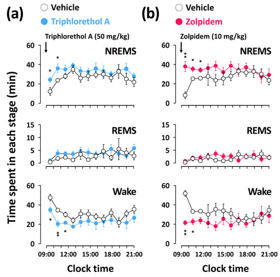Effects of triphlorethol A (a) and zolpidem (b) on time-course changes in NREMS, REMS, and wake for 12 h in C57BL/6N mice. Open and filled circles indicate the baseline day (vehicle) and experimental day (triphlorethol A or zolpidem), respectively. Each circle represents the hourly mean ± SEM (n = 7–8) of NREMS, REMS, and wake. * p < 0.05, ** p < 0.01, denote significantly different cases from the vehicle (unpaired Student’s t-test).