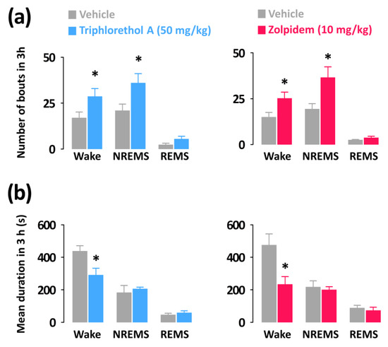 Characteristics of sleep-wake bouts in C57BL/6N mice during the 3 h period after administration of triphlorethol A and zolpidem. (a) Changes in the mean duration of wake, NREMS, and REMS bouts. (b) Changes in the total number of wake, NREMS, and REMS bouts. Grey bars indicate the baseline day (vehicle). Each value represents the mean ± SEM of each group (n = 7–8). * p < 0.05 denotes significantly different cases from the vehicle (unpaired Student’s t-test).