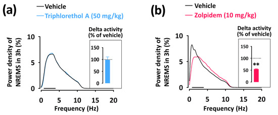 EEG power density curves of NREMS caused by triphlorethol A (a) and zolpidem (b). Delta activity in NREMS, an index of sleep intensity, is shown in the inset histogram. The bar (—) represents the range of the delta wave (0.5–4 Hz). ** p < 0.01, denotes significantly different cases from the vehicle (unpaired Student’s t-test).