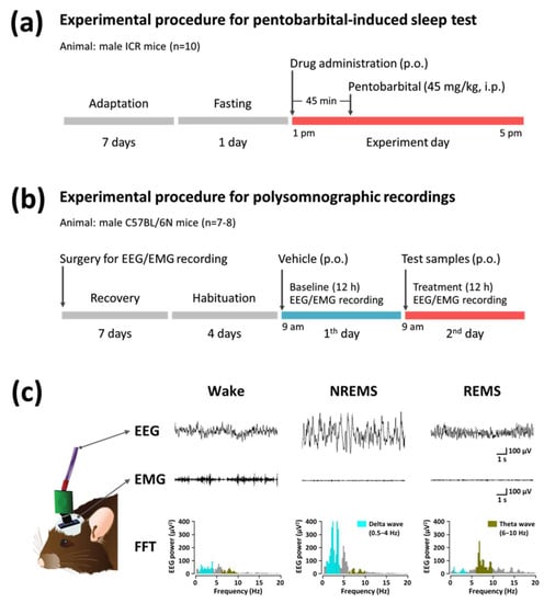 The experimental procedures and timeline for the pentobarbital-induced sleep test are shown in Figure 7a. All experiments were performed between 1:00 p.m. and 5:00 p.m., and mice were fasted for 24 h before experiment onset. Mice (n = 10) received drugs (p.o.) 45 min before pentobarbital injection. Control mice (vehicle solution: 0.5% carboxymethyl cellulose, 10 mL/kg) were tested in parallel with animals receiving drug treatments. After the administration of pentobarbital (45 mg/kg, i.p.), mice were placed in individual cages and observed for measurements of sleep latency and duration. Sleep latency was recorded from the time of pentobarbital injection to the time of sleep onset, and sleep duration was defined as the difference in time between the loss and recovery of the righting reflex. Observers who scored these variables were blind to the treatment groups.