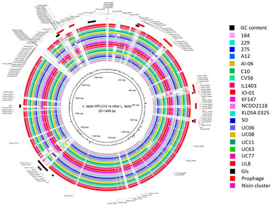 Blast Ring Image Generator (BRIG) diagram showing homologous chromosome segments of L. lactis subsp. lactis strains with genome of strain WFLU12 as reference. The outer circle contains genomic island regions (black), prophage (red), and nisin cluster (purple) of strain WFLU12. GC content is also shown in the figure. The indicated locus tag represents a stretch of singleton genes in WFLU12 compared to others.