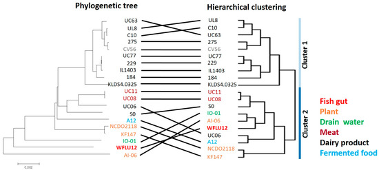 Comparison between hierarchical clustering and phylogenetic tree of L. lactis subsp. lactis strains. Both hierarchical clustering (right panel) based on shared gene content and phylogenetic tree (left panel) based on concatenated orthologous genes were performed for all 20 strains. Strings connecting the same strains of both trees are used to highlight the degree of similarities between both tree methods [21,22].