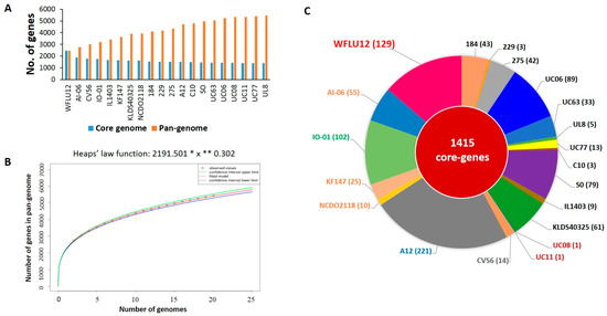 Pan-genome analyses of 20 L. lactis subsp. lactis strains. (A) Sizes of pan-genome and core genome of L. lactis subsp. lactis. (B) Pan-genome development extrapolation of 20 L. lactis subsp. lactis indicated an open pan-genome according to Heap’s Law model. (C) Calculated singleton gene sets to each chromosome. These were extracted using EDGAR [22]. Each strain is labeled by color-coding as indicated in Figure 2.