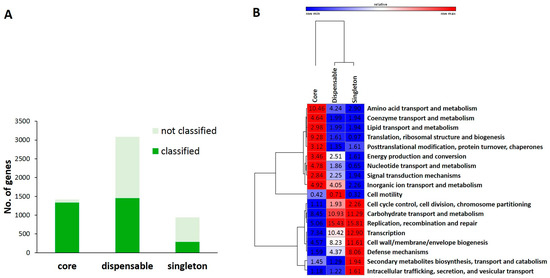 To determine functional differences between genomes, we performed re-annotation of all genomic subsets using PSI-BLAST against NCBI COG database (Figure 4). We obtained 1337, 1452, and 289 clusters with predicted functions for core, dispensable, and singleton genes, respectively. The rest (43%) of orthologous groups could not be annotated using the COG database. Most of these genes were located among dispensable and singleton genes (Figure 4A). Figure 4B shows non-uniform distribution of many predicted functional classes among functionally annotated genes. The core genome was found to be overrepresented by genes involved in the following functional classes: (1) translation, (2) ribosomal structure and biogenesis, and (3) amino acid transport and metabolism. In contrast, dispensable genes were overrepresented by genes belonged to functional classes such as replication/recombination/repair, carbohydrate transport and metabolism, transcription, and cell envelope biogenesis. Genes involved in replication, transcription, cell envelope biogenesis, carbohydrate transport, and metabolism were enriched in pooled singleton genes. This indicates that genes related to information storage processes (replication, recombination, and repair, and transcription) are more variable in the pan-genome but less variable in the core genome than genes related to translation and ribosome biogenesis. For functional groups of mobile elements such as transposase and site-specific recombinases, distribution of these genes was found to be nearly strain-specific. In addition, gene content for metabolism of amino acids was more conserved than that for carbohydrates. High frequency of genes for cell envelope biogenesis reflected high levels of various glycosyltransferases, carbohydrate modification proteins, and sortases. Carbohydrate transport and metabolism genes were also more frequently found in dispensable and singleton genes than those in core genes. This is also observed in other species such as Bifidobacterium and Lactobacillus [24,25].