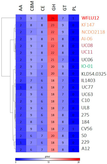 Generally, the range of polysaccharide substrates that arrives in the intestine from the diet is enormous [26]. Gut bacteria with a broad capacity to metabolize complex sugars have selective advantage that allows them to fill their ecological niche. Genome annotation confirmed that L. lactis had a variety of genes. Their gene clusters are specialized in fermentation of a wide spectrum of complex sugars (e.g., plant polysaccharides materials, like cellulose, xylan, pectin, and arabinan) other than lactose as growth substrates in a dairy environment [27,28,29], suggesting growth adaptation of L. lactis to variable substrates derived from their natural niches. In this study, a total of 117 CAZy were identified in the genome of L. lactis WFLU12. This number is similar to the number of CAZy found in other strains, ranging from 94 to 126 (Table S3). In particular, this analysis showed that strain WFLU12 had some CAZy families not found in other strains, such as AA6, CMB12, GH105, GH24, GH28, GH35, GH88, and PL8 (Table S3), indicating a distinctive CAZy profile of strain WFLU12 (Figure 5). In line with previous studies [10,27,29], these novel CAZy families/genes in strain WFLU12 belonged to a singleton genes repertoire comprising most strain-specific genes involved in carbohydrate metabolism. They are potentially required for its persistence in different ecological niches.