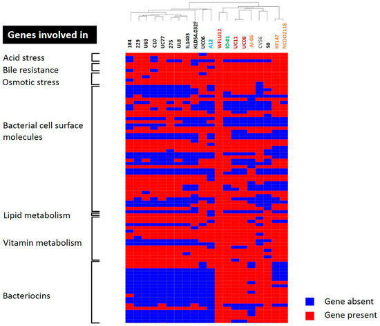 Hierarchical clustering of dispensable genes potentially involved in probiotic effects. The functions of genes were detailed in Tables S8–S10. Presence and absence of genes in each genome are indicated in red and blue, respectively. Each strain is color-coded, similar to those shown in Figure 2.