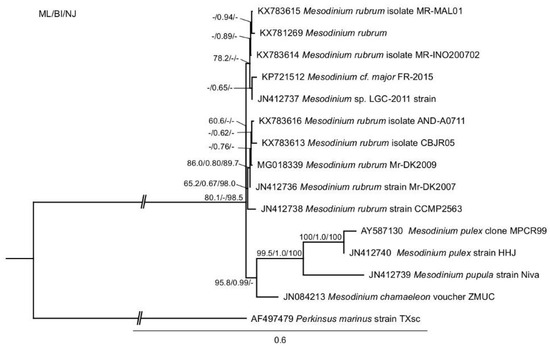 The phylogenetic analysis of M. rubrum was consistent with previous findings and showed four distinct clades that were represented by the Mesodinium rubrum complex, M. chamaeleon, M. pulex, and M. pupula [28,45]. The newly sequenced Danish (MrDK-2009) SSU-rDNA showed a 99.7% pairwise sequence identity with that of the Spanish (AND-A0711) strain (Figure 1).