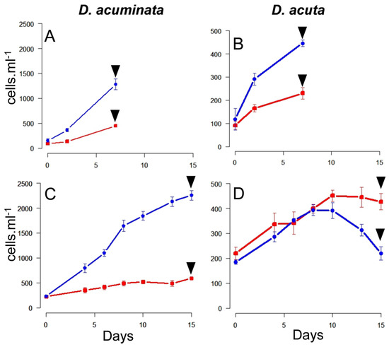 Growth curves during the first (A,B) and second (C,D) phase of Experiment 2. Dinophysis acuminata (A,C); D. acuta (B,D). Arrows indicate the harvesting day, blue and red lines correspond to Dinophysis cells fed Spanish and Danish Mesodinium rubrum, respectively. (Notice the different scale in the Y-axis for both species).
