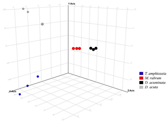 A multivariate analysis was used to estimate differences between phenotypes, at the chemical level, in relation to three variables: “species”, “prey origin”, and “nutritional status”. The variable “species” led to the highest separation within samples, followed by “prey origin”. The “nutritional status” did not provide clear-cut results in the case of D. acuta, neither during the growth experiments nor in the PCA analysis. In contrast, in the case of D. acuminata, distinct results were obtained depending on the “nutritional status”. Statistical analysis that was carried out here gave enough separation between the organisms, however future studies should include partial least square–discriminant (PLS-DA) analysis and Variable Importance in Projection VIP score plot, in addition to PCA to underscore such separation.
