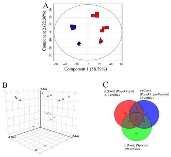 When Teleaulax and Mesodinium were excluded from the dataset, D. acuminata and D. acuta were clearly separated by the variable “species” (Figure 5A), also showing the highest number of species-specific compounds (p < 0.001; see Tables S3A–C and S4A–C for compounds specific to both Dinophysis species ranked by increasing p-values). This example also highlights the meaning of each principal component, as component 1 (Figure 5A) corresponds to the separation according to species, whereas component 2 corresponds to grouping according to prey origin. As component 2 explains less than half of the variability as compared to component 1, the variable “species” can be considered most important, followed by prey origin.