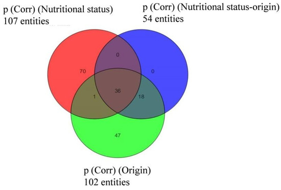 Venn diagram indicating the distribution of compounds specific to or common within groups of Dinophysis acuminata depending on “prey origin” and “nutritional status” from Experiment 2 (ESI−).
